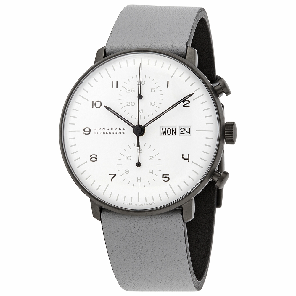 Gunmetal PVD stainless steel case with a grey leather strap. Fixed gunmetal PVD bezel. White dial with luminous grey hands and Arabic numeral hour markers. Minute markers around the outer rim. Dial Type: Analog. Luminescent hands. Day of the week and date display at the 3 o'clock position. Chronograph - two sub-dials displaying: 12 hours and 30 minutes. Junghans calibre J880.2 automatic movement, based upon ETA 7750, containing 25 Jewels, bitting at 28800 vph, and has a power reserve of approximately 42 hours. Scratch resistant plexiglass crystal with a sicralan coating. Pull / push crown. Screwed case back. Round case shape. Case size: 40 mm. Case thickness: 14.4 mm. Band width: 20 mm. Tang clasp. Water resistant at 30 meters / 100 feet. Functions: chronograph, date, hour, minute, second. Max Bill Chronoscope Series. Luxury watch style. Watch label: Made in Germany. Junghans Max Bill Chronoscope Chronograph Automatic White Dial Mens Watch 027/4008.05.