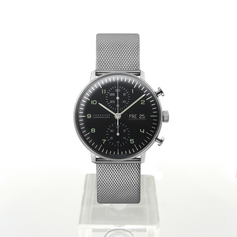 Silver-tone stainless steel case and bracelet. Black dial with silver-tone hands and Arabic numeral hour markers. Dial Type: Analog. Luminescent hands and markers. Date display at the 3 o'clock position. Chronograph - sub-dials displaying: 12 hours, 30 minutes. Junghans Calibre J880.2 Automatic movement, based upon ETA 7750, containing 25 Jewels, bitting at 28800 vph, and has a power reserve of approximately 42 hours. Scratch resistant plexiglass crystal. Round case shape, case size: 40 mm. Folding clasp. Water resistant at 30 meters / 100 feet. Functions: chronograph, date, hour, minute, second. Max Bill Chronoscope Series. Watch label: Made in Germany. Junghans Max Bill Chronoscope Chronograph Automatic Black Dial Mens Watch 027/4500.48.