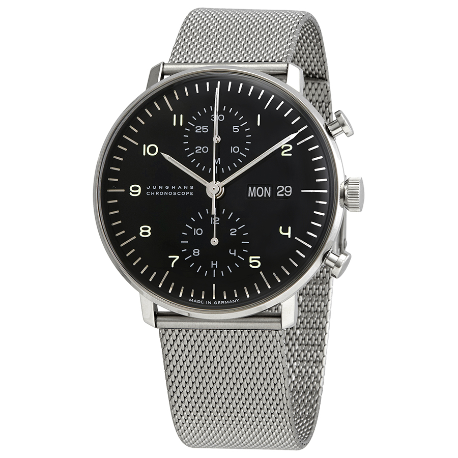 Silver-tone stainless steel case with a silver-tone mesh stainless steel bracelet. Fixed silver-tone stainless steel bezel. Black dial with silver-tone hands and Arabic numeral hour markers. Minute markers around the outer rim. Dial Type: Analog. Date display between 4 and 5 o'clock position. Chronograph - two sub-dials displaying: 12 hour and 30 second. Junghans Calibre J880.2 Automatic movement, based upon ETA 7750, containing 25 Jewels, bitting at 28800 vph, and has a power reserve of approximately 42 hours. Scratch resistant mineral crystal. Pull / push crown. Solid case back. Round case shape, case size: 40 mm. Tang clasp. Water resistant at 30 meters / 100 feet. Functions: chronograph, date, hour, minute, second. Max Bill Chronoscope Series. Sport watch style. Watch label: Made in Germany. Junghans Max Bill Chronoscope Chronograph Automatic Black Dial Mens Watch 027/4500.49.