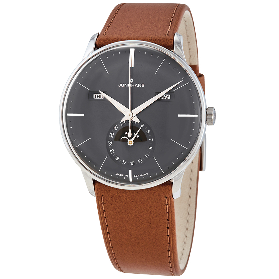 Silver-tone stainless steel case with a brown horseskin leather strap. Fixed silver-tone stainless steel bezel. Grey dial with silver-tone hands and index hour markers. Minute markers around the outer rim. Dial Type: Analog. Date display at the 6 o'clock position. One date/moonphase subdials. Junghans Calibre J800.3 automatic movement with a 38-hour power reserve. Scratch resistant convex hard plexiglass crystal. Pull / push crown. Round case shape, case size: 40.4 mm, case thickness: 12 mm. Water resistant at 30 meters / 100 feet. Functions: month, date, day, hour, minute, month, moon phase. Dress watch style. Watch label: Made in Germany. Junghans Meister Kalendar Automatic Grey Dial Mens Watch 027/4906.01.