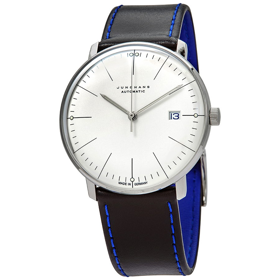 Stainless steel case with a black leather (blue backed) strap. Fixed stainless steel bezel. White dial with silver-tone hands and index hour markers. Minute markers around the outer rim. Dial Type: Analog. Date display at the 3 o'clock position. Junghans calibre J800.1 automatic movement, based upon ETA 2824-2, containing 25 Jewels, bitting at 28800 vph, and has a power reserve of approximately 42 hours. Scratch resistant sapphire crystal. Pull / push crown. Solid case back. Round case shape. Case size: 40 mm. Case thickness: 10 mm. Band width: 20 mm. Tang clasp. Water resistant at 30 meters / 100 feet. Functions: date, hour, minute, second. Additional Info: set includes wall clock. Max Bill Chronoscope Series. Dress watch style. Watch label: Made in Germany. Junghans Max Bill Chronoscope Automatic Mens Watch and Wall Clock Set 363/2816.00.