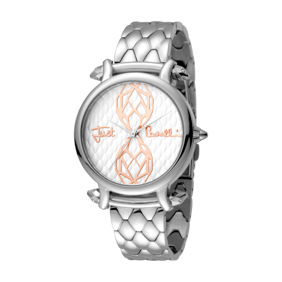 Silver-tone stainless steel case with a silver-tone stainless steel bracelet. Fixed silver-tone bezel. Silver-tone dial with silver-tone hands. Dial Type: Analog. Seiko VJ21 quartz movement. Scratch resistant mineral crystal. Solid case back. Round case shape. Case size: 34 mm. Fold over with safety release clasp. Water resistant at 50 meters / 165 feet. Functions: hour, minute, second. Fashion watch style. Just Cavalli Aniimal Quartz Silver Dial Ladies Watch JC1L061M0045.