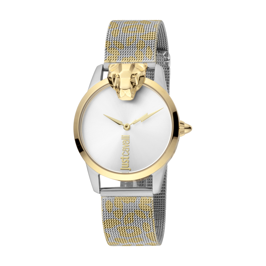 Silver-tone stainless steel case with a two-tone (silver-tone & gold-tone) stainless steel bracelet. Fixed gold-tone bezel. Silver-tone dial with gold-tone hands. Dial Type: Analog. Quartz movement. Scratch resistant mineral crystal. Pull / push crown. Solid case back. Round case shape, case size: 32 mm, case thickness: 8 mm. Band width: 12 mm, band length: 7 inches. Deployment with push button release clasp. Water resistant at 50 meters / 165 feet. Functions: hour, minute. Fashion watch style. Just Cavalli Animal Quartz Silver Dial Ladies Watch JC1L057M0295.