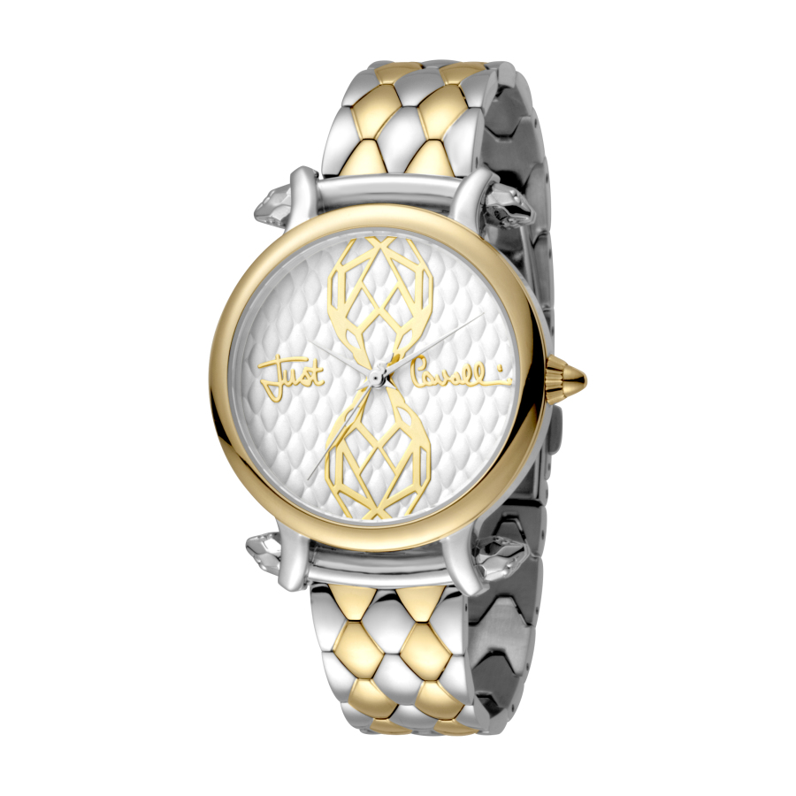 Silver-tone stainless steel case with a two-tone stainless steel bracelet. Fixed gold-tone stainless steel bezel. Silver-tone dial with silver-tone hands. Dial Type: Analog. Seiko VJ21 quartz movement. Scratch resistant mineral crystal. Solid case back. Round case shape, case size: 34 mm, case thickness: 8 mm. Band width: 14 mm. Fold over with safety release clasp. Water resistant at 50 meters / 165 feet. Functions: hour, minute, second. Fashion watch style. Just Cavalli Animal Quartz Silver Dial Ladies Watch JC1L061M0095.