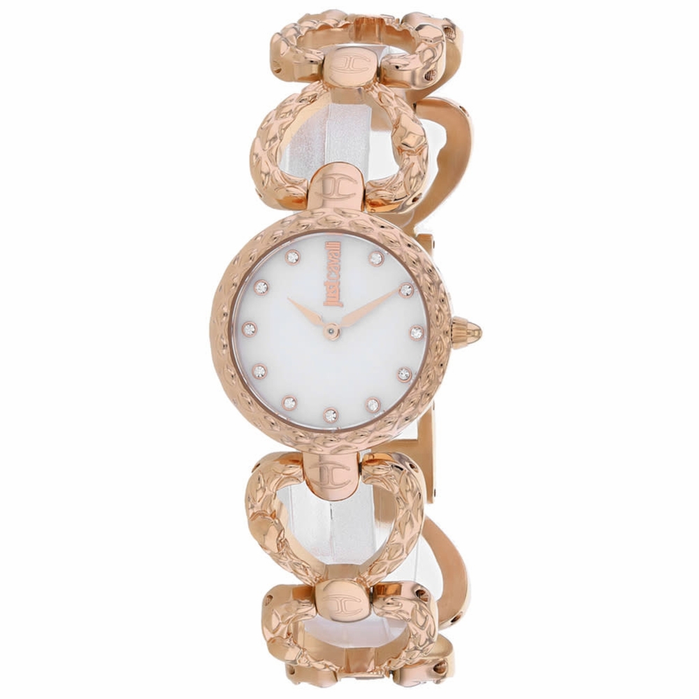 Rose gold-tone stainless steel case and bracelet. Fixed rose gold-tone stainless steel bezel. Mother of pearl dial with rose gold-tone hands and index hour markers. Dial Type: Analog. Quartz movement. Scratch resistant mineral crystal. Pull / push crown. Solid case back. Round case shape, case size: 31 mm, case thickness: 8 mm. Band width: 24 mm, band length: 7.5 inches. Jewelry clasp. Water resistant at 50 meters / 165 feet. Functions: hour, minute. Dress Series. Fashion watch style. Just Cavalli Dress Mother of Pearl Dial Ladies Watch JC1L132M0035.