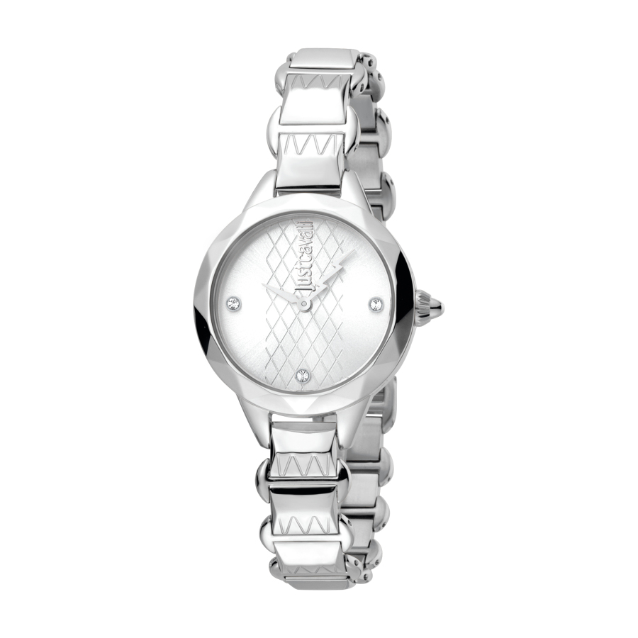 Silver-tone stainless steel case with a silver-tone stainless steel bracelet. Fixed silver-tone stainless steel bezel. Silver-tone dial with silver-tone hands and index hour markers. Dial Type: Analog. Quartz movement. Scratch resistant mineral crystal. Solid case back. Round case shape, case size: 30 mm, case thickness: 9 mm. Band width: 11 mm. Jewelry clasp. Water resistant at 50 meters / 165 feet. Functions: hour, minute. Fashion watch style. Just Cavalli Estro Quartz Silver Dial Ladies Watch JC1L033M0015.