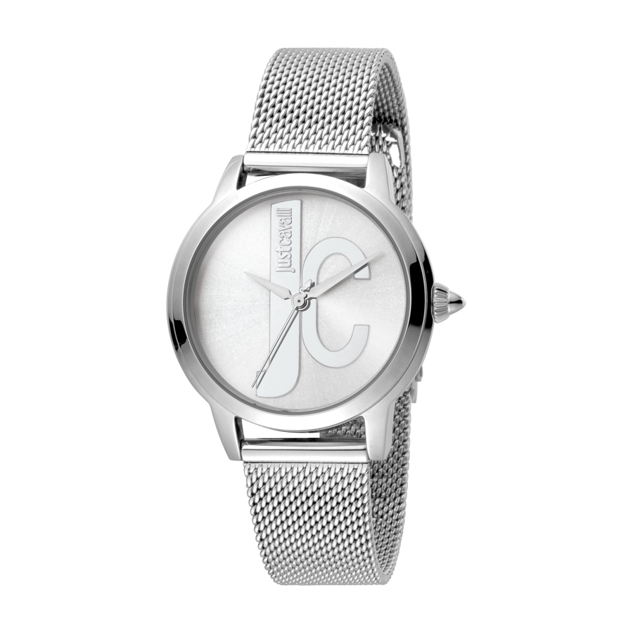 Silver-tone stainless steel case with a silver-tone mesh stainless steel bracelet. Fixed silver-tone stainless steel bezel. Silver-tone dial with silver-tone alpha-style shape hands. Dial Type: Analog. TMI Caliber VJ21 quartz movement. Scratch resistant mineral crystal. Solid case back. Round case shape, case size: 34 mm, case thickness: 8 mm. Band width: 16 mm. Buckle clasp. Water resistant at 50 meters / 165 feet. Functions: hour, minute, second. Fashion watch style. Watch label: Japan Movt. Just Cavalli JC set Quartz Silver Dial Ladies Watch JC1L050M0065.