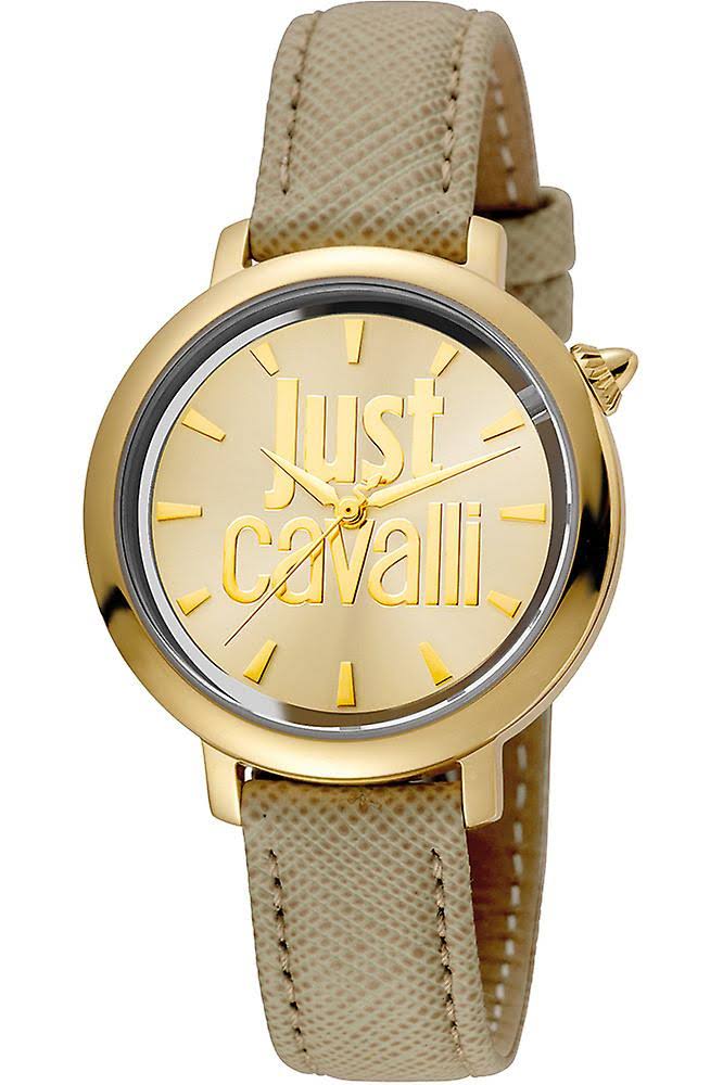 Gold-tone stainless steel case with a ivory leather strap. Fixed stainless steel bezel. Gold dial with gold-tone hands and index hour markers. Dial Type: Analog. Quartz movement. Scratch resistant mineral crystal. Pull / push crown. Solid case back. Case size: 34 mm. Case thickness: 10 mm. Round case shape. Band width: 18 mm. Band length: 7.5 inches. Tang clasp. Water resistant at 50 meters / 165 feet. Functions: hour, minute, second. Casual watch style. Just Cavalli Gold Dial Ladies Leather Watch JC1L007L0025.