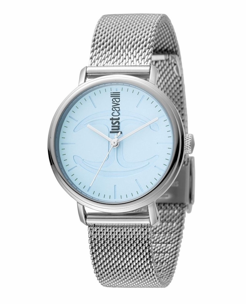 Silver-tone stainless steel case with a silver stainless steel bracelet. Fixed silver-tone bezel. Blue dial with silver-tone hands and index hour markers. Minute markers around the outer rim. Dial Type: Analog. Miyota Caliber 2035 quartz movement. Scratch resistant mineral crystal. Round case shape, case size: 34 mm, case thickness: 9 mm. Band width: 9 mm, band length: 7.5 inches. Hook buckle clasp. Water resistant at 30 meters / 100 feet. Functions: hour, minute, second. Casual watch style. Watch label: Japan Movt. Just Cavalli CFC Blue Dial Ladies Watch JC1L012M0065.