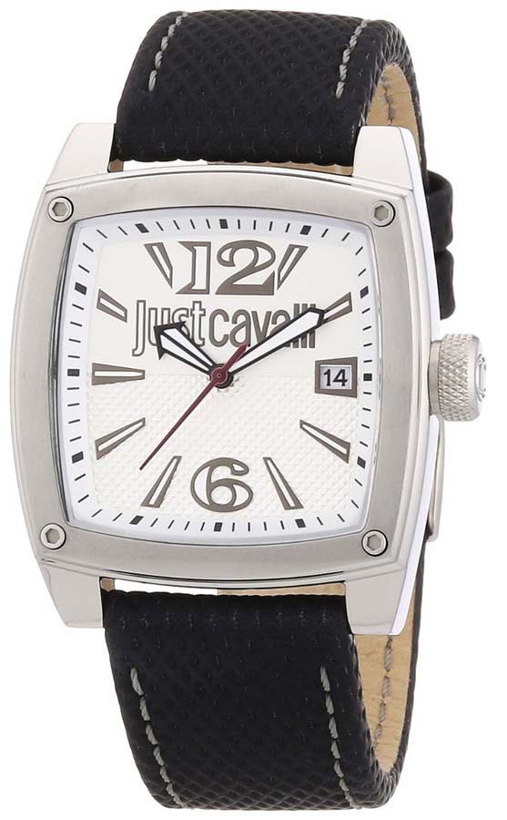 Silver-tone stainless steel case with a silver-tone stainless steel bracelet. Fixed silver-tone stainless steel bezel. White dial with black hands and index hour markers. Dial Type: Analog. Date display at the 3 o'clock position. Quartz movement. Scratch resistant mineral crystal. Push/pull crown. Solid case back. Square case shape, case size: 38 mm, case thickness: 12 mm. Band width: 21 mm, band length: 8.5 in. Fold over clasp. Water resistant at 50 meters / 165 feet. Functions: date, hour, minute, second. Casual watch style. Just Cavalli Pulp White Dial Mens Watch R7251583002.