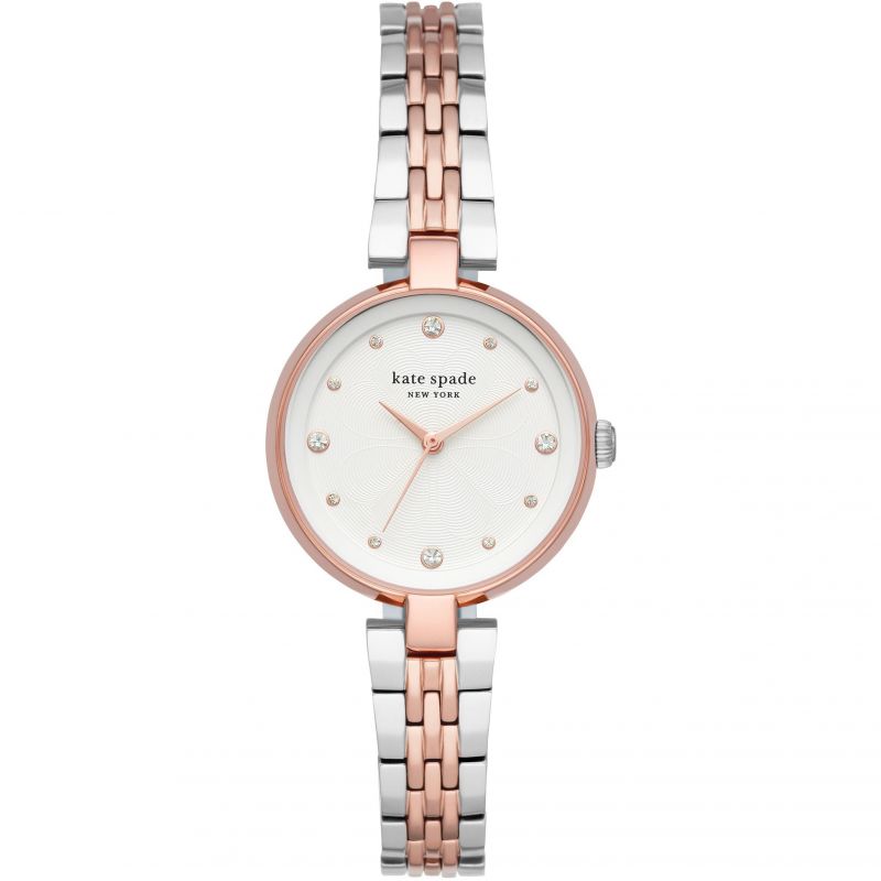 Rose gold-tone stainless steel case with a two-tone (silver-tone and rose gold-tone) stainless steel bracelet. Fixed rose gold-tone bezel. White dial with rose gold-tone hands and crystal hour markers. Dial Type: Analog. Quartz movement. Scratch resistant mineral crystal. Pull / push crown. Solid case back. Round case shape. Case size: 30 mm. Case thickness: 7 mm. Band width: 10 mm. Fold over clasp. Water resistant at 30 meters / 100 feet. Functions: hour, minute, second. Annadale Series. Casual watch style. Kate Spade Annadale Quartz Crystal White Dial Ladies Watch KSW1595.