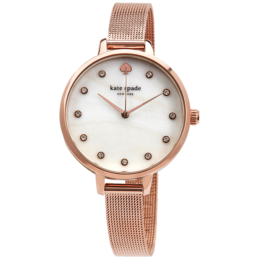 Rose gold-tone stainless steel case with a rose gold-tone stainless steel mesh bracelet. Fixed rose gold-tone bezel. Mother of pearl dial with rose gold-tone hands and crystal hour markers. The Kate Spade logo appears at the 12 o'clock position. Dial Type: Analog. Quartz movement. Scratch resistant mineral crystal. Pull / push crown. Solid case back. Round case shape. Case size: 34 mm. Case thickness: 8 mm. Band width: 10 mm. Fold over slip through clasp. Water resistant at 30 meters / 100 feet. Functions: hour, minute, second. Metro Series. Dress watch style. Kate Spade Metro Mother of Pearl Crystal Dial Ladies Watch KSW1492.