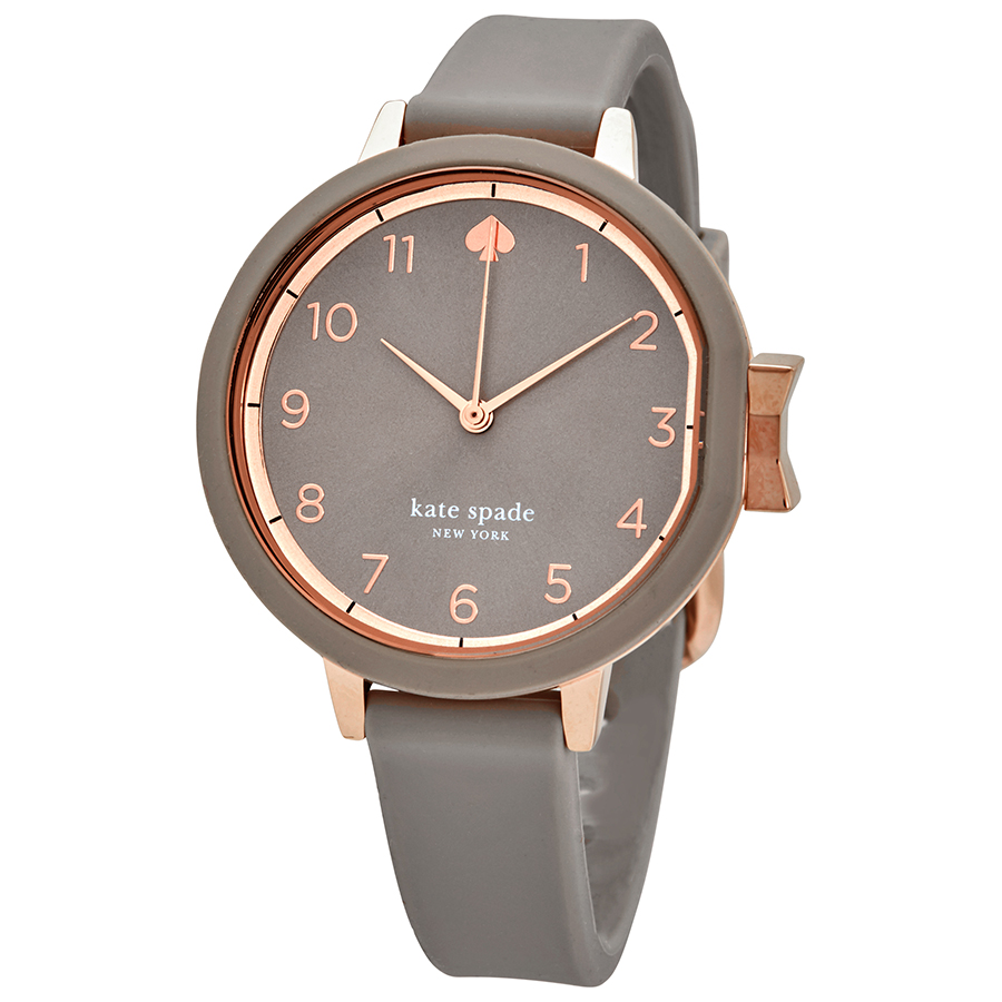 Rose gold-tone metal case with a grey silicone strap. Fixed grey silicone bezel. Grey dial with rose gold-tone hands and Arabic numeral hour markers. The Kate Spade logo appears at the 12 o'clock position. Dial Type: Analog. Quartz movement. Scratch resistant mineral crystal. Pull / push crown. Solid case back. Round case shape. Case size: 34 mm. Case thickness: 7 mm. Band width: 12 mm. Tang clasp. Water resistant at 30 meters / 100 feet. Functions: hour, minute, second. Additional Info: will withstand splashes in water. Dress watch style. Watch label: Japan Movt. Kate Spade New York Quartz Grey Dial Ladies Watch KSW1519.
