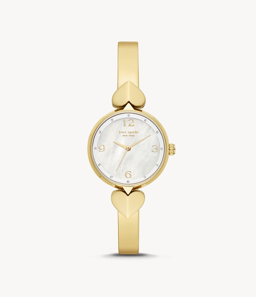 Yellow gold-tone stainless steel case and bracelet. Fixed yellow gold-tone bezel. Mother of pearl dial with yellow gold-tone hands and crystal hour markers. Arabic numerals appear at the 3, 6, 9 and 12 o'clock positions. Dial Type: Analog. Quartz movement. Scratch resistant mineral crystal. Pull / push crown. Solid case back. Round case shape. Case size: 30 mm. Case thickness: 7 mm. Band width: 8 mm. Fold over clasp. Water resistant at 30 meters / 100 feet. Functions: hour, minute, second. Casual watch style. Kate Spade Quartz Crystal Ladies Watch KSW1643.