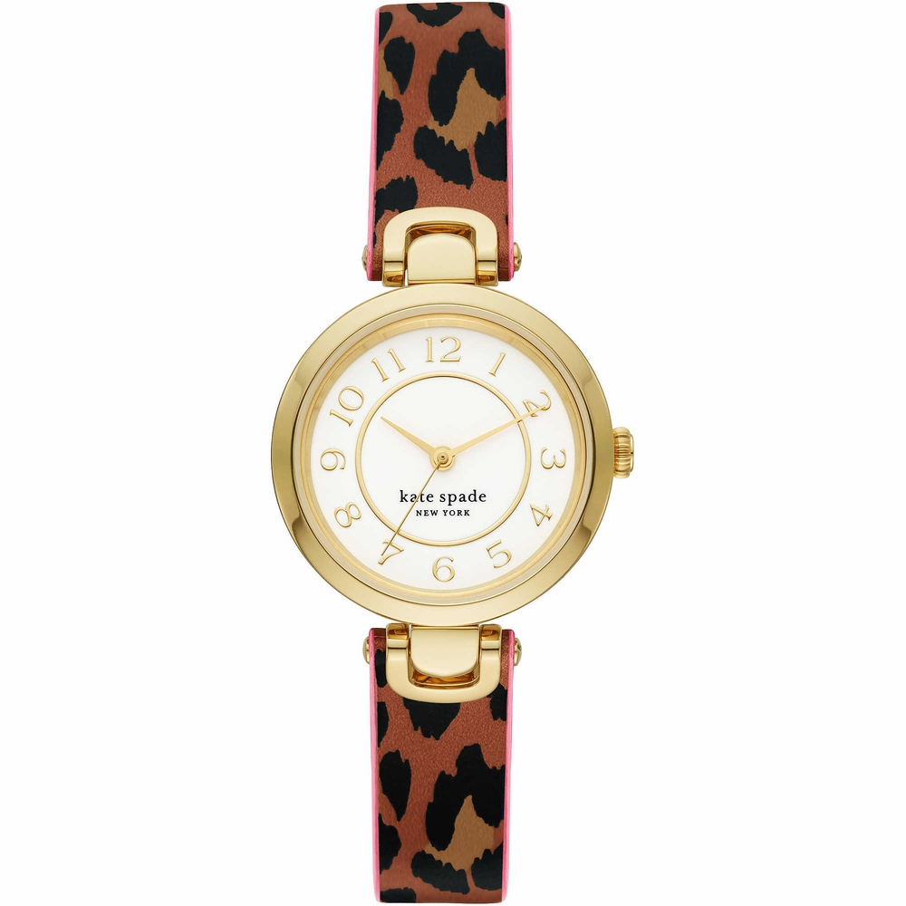 Yellow gold-tone stainless steel case with a leopard print (reversible) leather strap. Fixed yellow gold-tone bezel. White dial with yellow gold-tone hands and Arabic numeral hour markers. Dial Type: Analog. Quartz movement. Scratch resistant mineral crystal. Pull / push crown. Solid case back. Round case shape. Case size: 30 mm. Case thickness: 5 mm. Band width: 10 mm. Tang clasp. Water resistant at 30 meters / 100 feet. Functions: hour, minute, second. Rainey Park Series. Casual watch style. Kate Spade Rainey Park Quartz White Dial Watch KSW1637.