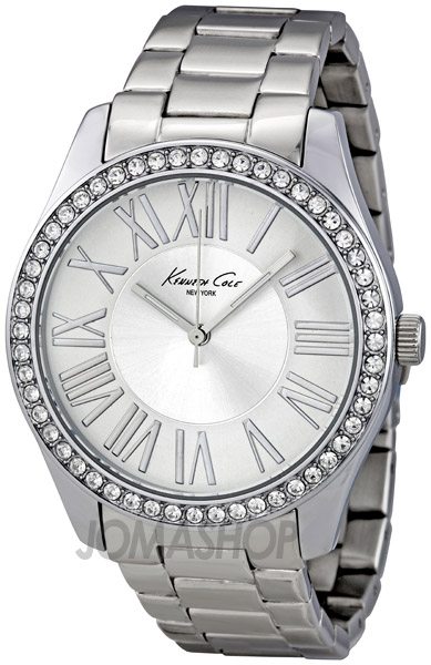 Stainless steel case with a stainless steel bracelet. Fixed stainless steel bezel set with crystals. White / silver dial with luminous silver-tone hands and Roman numeral hour markers. Dial Type: Analog. Luminescent hands. Japanese quartz movement. Scratch resistant mineral crystal. Solid case back. Case diameter: 42 mm. Case thickness: 7 mm. Band width: 11 mm. Deployment clasp with push button release. Water resistant at 30 meters / 100 feet. Functions: hours, minutes, seconds. Casual watch style. Kenneth Cole New York Stainless Steel White Silver Dial Ladies Watch KC4797.