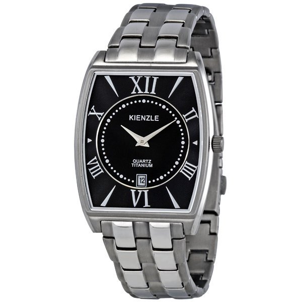 Titanium case with a titanium bracelet. Fixed titanium bezel. Black dial with silver-tone hands and alternating index and Roman numeral hour markers. Minute markers around an inner ring. Dial Type: Analog. Luminescent hands and markers. Date display at the 6 o'clock position. Quartz movement. Scratch resistant mineral crystal. Push / pull crown. Solid case back. Case dimensions: 34 mm x 44 mm. Case thickness: 6 mm. Band width: 20 mm. Band length: 8.5 inches. Fold over clasp with push button safety. Water resistant at 30 meters (100 feet). Functions: date, hour, minute. Watch label: Germany. Kienzle Klassik Mens Watch V81091343250.