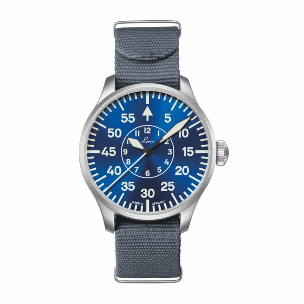 There are pilot watches and then there are pilot watches from Laco. With a Laco pilot watch, you are not only wearing a precise and robust watch on your wrist, but also a piece of history. Silver-tone stainless steel case with a grey nylon strap. Fixed silver-tone stainless steel bezel. Blue dial with black hands and Arabic numeral hour markers. Minute markers around the outer rim. Dial Type: Analog. Luminescent hands and markers. Miyota Caliber 821A-43A Automatic movement, based upon Miyota 821A, bitting at 21600 vph, and has a power reserve of approximately 42 hours. Scratch resistant sapphire crystal. Pull / push crown. Transparent case back. Round case shape, case size: 42 mm. Band width: 20 mm. Buckle clasp. Water resistant at 50 meters / 165 feet. Functions: date, hour, minute, second. Aachen Series. Military watch style. Watch label: Japan Movt. Laco Aachen Automatic Blue Dial Mens Watch 862101.