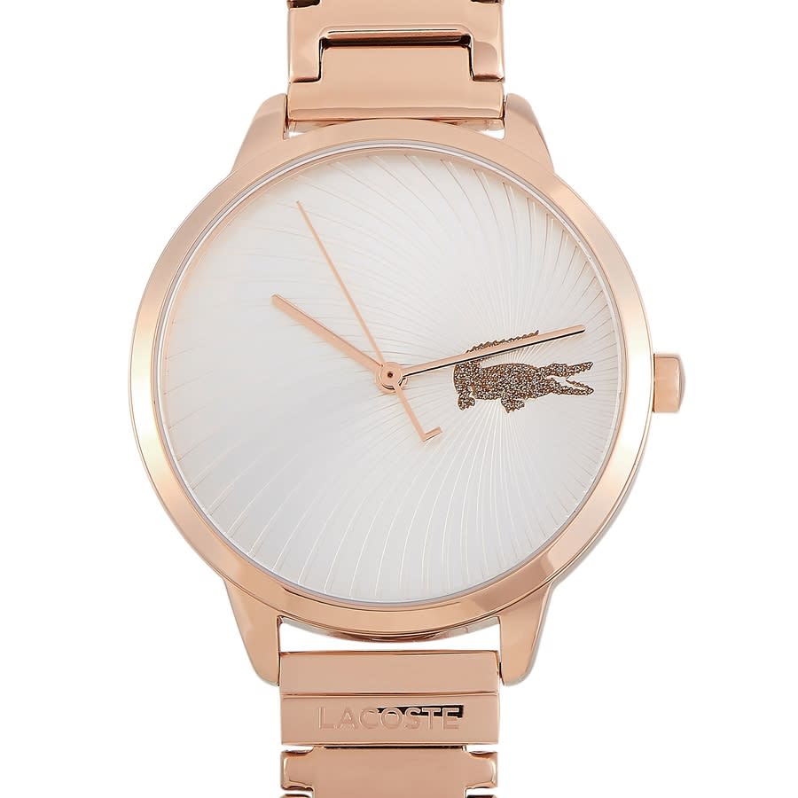Rose gold-tone stainless steel case and bracelet. Fixed rose gold-tone stainless steel bezel. Silver-tone dial with rose gold-tone hands. Dial Type: Analog. Quartz movement. Solid case back. Round case shape, case size: 38 mm. Hidden clasp. Water resistant at 30 meters / 100 feet. Functions: hour, minute, second. Lexi Series. Luxury watch style. Lacoste Lexi Quartz Silver Dial Ladies Watch 2001060.
