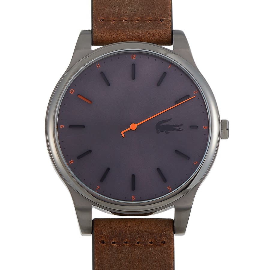Silver-tone stainless steel case with a brown leather strap. Fixed silver-tone stainless steel bezel. Gray dial with orange hands and index hour markers. Minute markers around the outer rim. Dial Type: Analog. Quartz movement. Solid case back. Round case shape, case size: 43 mm. Buckle clasp. Water resistant at 50 meters / 165 feet. Functions: hour, minute, second. Kyoto Series. Luxury watch style. Lacoste Kyoto Quartz Mens Watch 2010968.