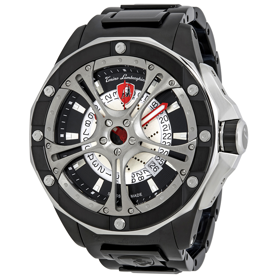 Black stainless steel case with a black stainless steel bracelet. Black bezel. Grey dial with red hands and index hour markers. Dial Type: Analog. Luminescent hands. Date display at the 5 o'clock position. Ronda Caliber RL 715 quartz movement. Scratch resistant mineral crystal. Round case shape, case size: 54 mm, case thickness: 12 mm. Water resistant at 50 meters / 165 feet. Functions: date, hour, minute. Sport watch style. Watch label: Swiss Made. Lamborghini New Mesh Grey Dial Mens Stainless Steel Watch 849.