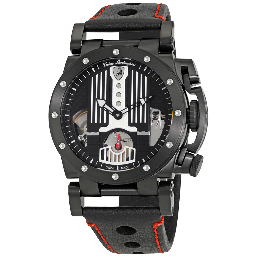 Black PVD stainless steel case with a black leather strap. Fixed black PVD bezel. Ground carbon fiber dial with luminous black hands and index hour markers. Dial Type: Analog. Luminescent hands. UT 6498-2 automatic movement. Scratch resistant sapphire crystal. Case size: 52 mm. Round case shape. Deployment clasp. Water resistant at 100 meters / 330 feet. Functions: hour, minute. Sport watch style. Watch label: Swiss Made. Lamborghini Centenary Automatic Carbon Fiber Dial Mens Watch LR51-02.