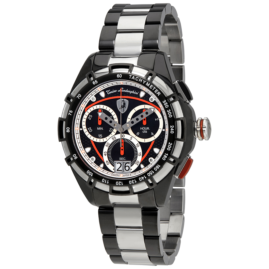Silver and black stainless steel case with a silver and black stainless steel bracelet. Black dial with silver-tone hands and index hour markers. Tachymeter. Dial Type: Analog. Luminescent hands and markers. Date display at the 6 o'clock position. Chronograph - three sub-dials displaying: 60 second, 30 minute and 12 hours. Ronda Caliber RL 8040.B quartz movement. Scratch resistant sapphire crystal. Case size: 52 mm. Round case shape. Water resistant at 100 meters / 330 feet. Functions: chronograph, date, hour, minute, second. Sport watch style. Watch label: Swiss Made. Lamborghini 9060 Black and Orange Dial Mens Chronograph Watch N-Orange.