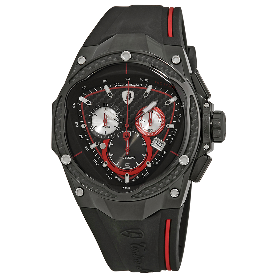 Black PVD stainless steel case with a black and red rubber strap. Fixed black PVD bezel with a carbon fiber inlay. Black dial with luminous black hands and index hour markers. Minute markers. Tachymeter marking around the outer rim. Dial Type: Analog. Luminescent hands and markers. Date display at the 3 o'clock position. Chronograph - three sub-dials displaying: 60 second, 30 minute and 1/10th of a second. Quartz movement. Scratch resistant sapphire crystal. Solid case back. Round case shape. Case dimensions: 47 mm x 43 mm. Buckle clasp. Water resistant at 100 meters / 330 feet. Functions: chronograph, date, hour, minute, second. Sport watch style. Watch label: Swiss Made. Lamborghini Chronograph Black Dial Mens Watch RDL05.