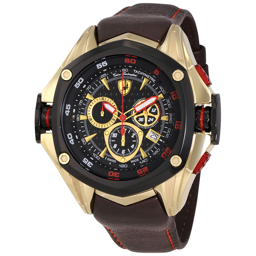 Gold-tone stainless steel case with a brown leather strap. Black bezel. Black dial with gold-tone hands and index hour markers. Tachymeter. Dial Type: Analog. Luminescent hands. Date display at the 4 o'clock position. Chronograph - three sub-dials displaying: 60 second, 30 minute and 12 hours. RL5030.D quartz movement. Scratch resistant mineral glass sapphire coated crystal. Case size: 52.50 mm. Round case shape. Water resistant at 100 meters / 330 feet. Functions: chronograph, date, hour, minute, second. Sport watch style. Watch label: Swiss Made. Lamborghini Scissor Doors Black Dial Mens Chronograph Watch SCISSOR DOORS 04.