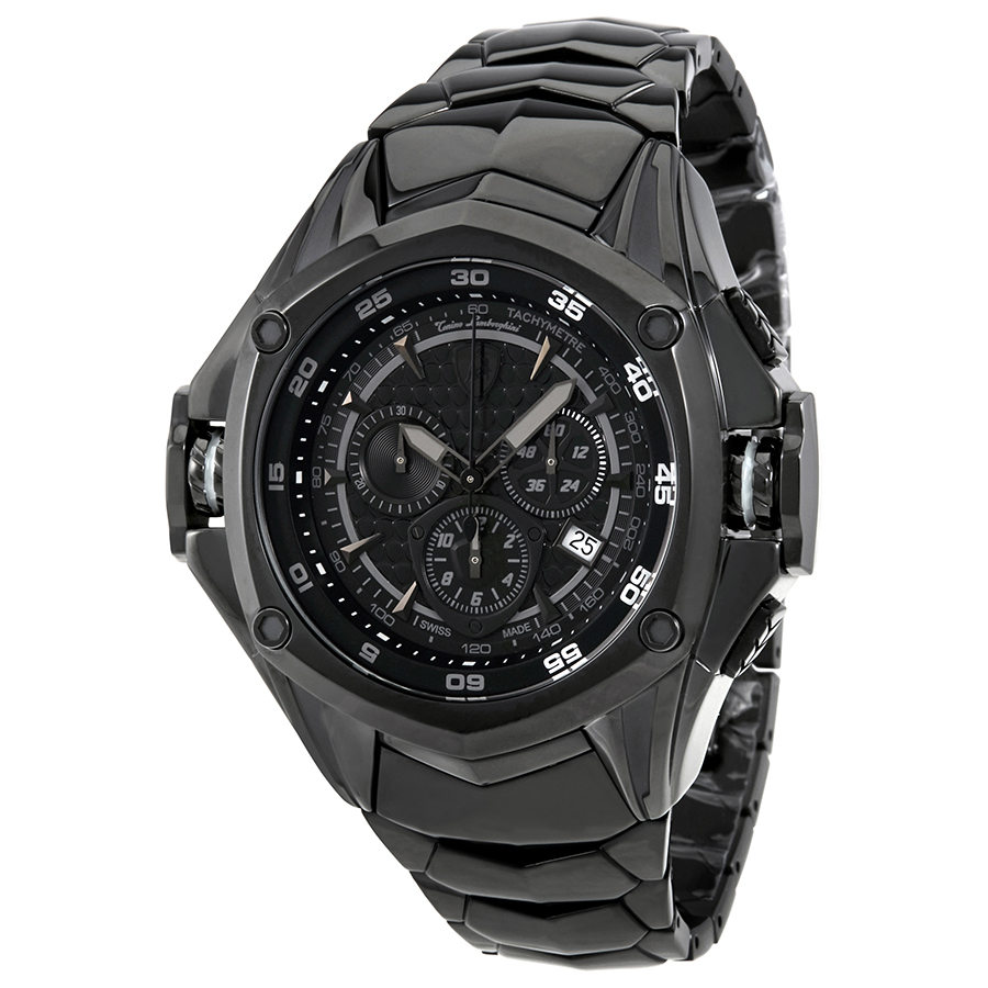 Black PVD stainless steel case with a black PVD stainless steel bracelet. Fixed black PVD stainless steel bezel. Black dial with black hands and index hour markers. Tachymeter. Dial Type: Analog. Luminescent hands. Date display at the 4 o'clock position. RL 5030.D quartz movement. Scratch resistant mineral glass sapphire coated crystal. Case size: 52.50 mm. Round case shape. Water resistant at 100 meters / 330 feet. Functions: chronograph, date, hour, minute, second. Sport watch style. Watch label: Swiss Made. Lamborghini Scissor Doors Black Dial Mens Watch SCISSOR DOORS 06.