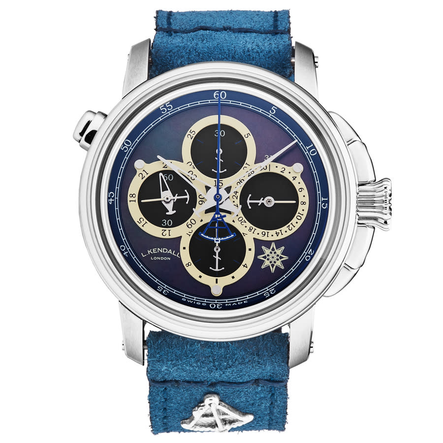 Silver-tone stainless steel case with a blue leather strap. Fixed stainless steel bezel. Mother of pearl dial with silver-tone hands and Arabic numeral hour markers. Minute markers around the outer rim. Dial Type: Analog. Automatic movement. Pull / push crown. Transparent see through case back. Round case shape, case size: 46 mm, case thickness: 18.5 mm. Band width: 23 mm, band length: 8 inches. Buckle clasp. Water resistant at 100 meters / 330 feet. Functions: chronograph, GMT, date, hour, minute, second. Additional Info: hours, minutes, seconds, chrono, date, GMT. K4 Series. Luxury watch style. Watch label: Swiss Made. Larcum Kendall K4 Chronograph Automatic Mens Watch K4-001B.