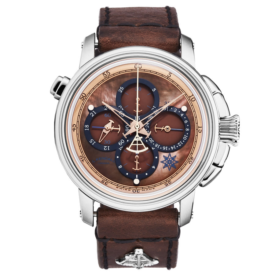 Silver-tone stainless steel case with a brown leather strap. Fixed silver-tone stainless steel bezel. Mother of pearl dial with rose gold-tone hands and Arabic numeral hour markers. Minute markers around the outer rim. Dial Type: Analog. Automatic movement. Pull / push crown. Transparent see through case back. Round case shape, case size: 46 mm, case thickness: 18.5 mm. Band width: 23 mm, band length: 8 inches. Buckle clasp. Water resistant at 100 meters / 330 feet. Functions: GMT, chronograph, date, hour, minute, second. Additional Info: hours, minutes, seconds, chrono, date, GMT. K4 Series. Luxury watch style. Watch label: Swiss Made. Larcum Kendall K4 Chronograph Automatic Mens Watch K4-002B.