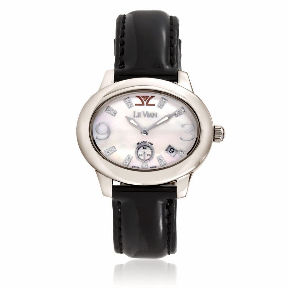 Silver-tone stainless steel case with a black leather strap. Fixed silver-tone stainless steel bezel. White dial with silver-tone hands and Arabic numeral & index hour markers. Dial Type: Analog. Luminescent hands. Date display between 4 and 5 o'clock position. Quartz movement. Round case shape, case size: 40 mm. Buckle clasp. Functions: date, hour, minute, second. Le Vian Time Series. Fashion watch style. Watch label: Swiss Made. Le Vian Le Vian Time Quartz White Dial Mens Watch ZAG 217.