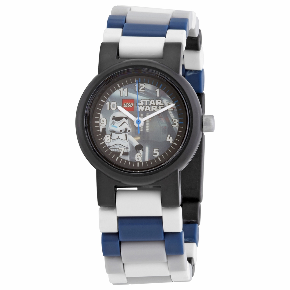 Black plastic case with a black, white, blue brass bracelet. Fixed black plastic bezel. Multicolor dial with white hands and Arabic numeral hour markers. Dial Type: Analog. Quartz movement. Scratch resistant mineral crystal. Pull / push crown. Solid case back. Round case shape. Water resistant at 50 meters / 165 feet. Functions: hour, minute, second. Casual watch style. Lego Kids Star Wars Stormtropper Buildable Link Watch.