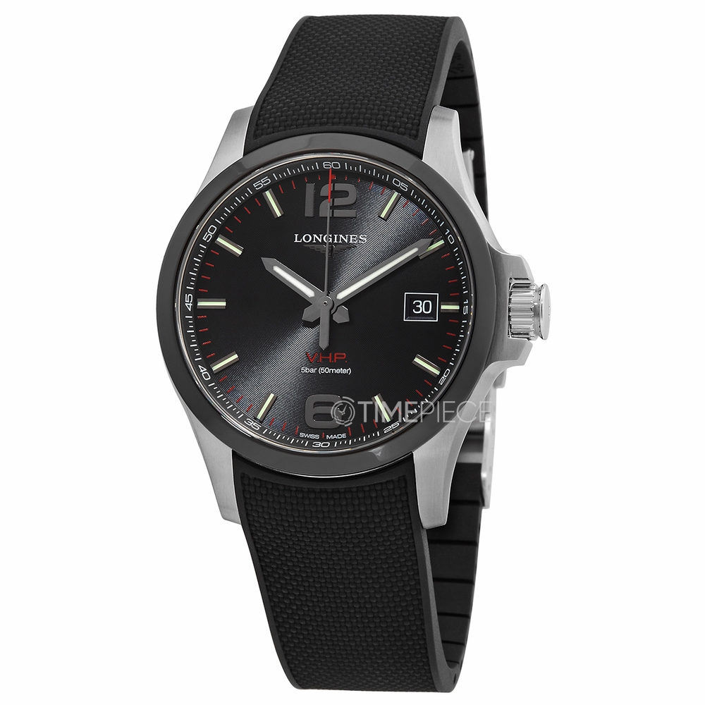 Black stainless steel case with a black rubber strap. Fixed black stainless steel bezel. Black dial with black hands and index hour markers. Minute markers around the outer rim. Dial Type: Analog. Luminescent hands and markers. Date display at the 3 o'clock position. Longines Calibre L288 quartz movement. Scratch resistant sapphire crystal. Screw down crown. Transparent see through case back. Round case shape, case size: 43 mm. Deployment with push button release clasp. Water resistant at 50 meters / 165 feet. Functions: date, hour, minute, second. Conquest Series. Luxury watch style. Watch label: Swiss Made. Longines Conquest Quartz Black Dial Mens Watch L37294569.