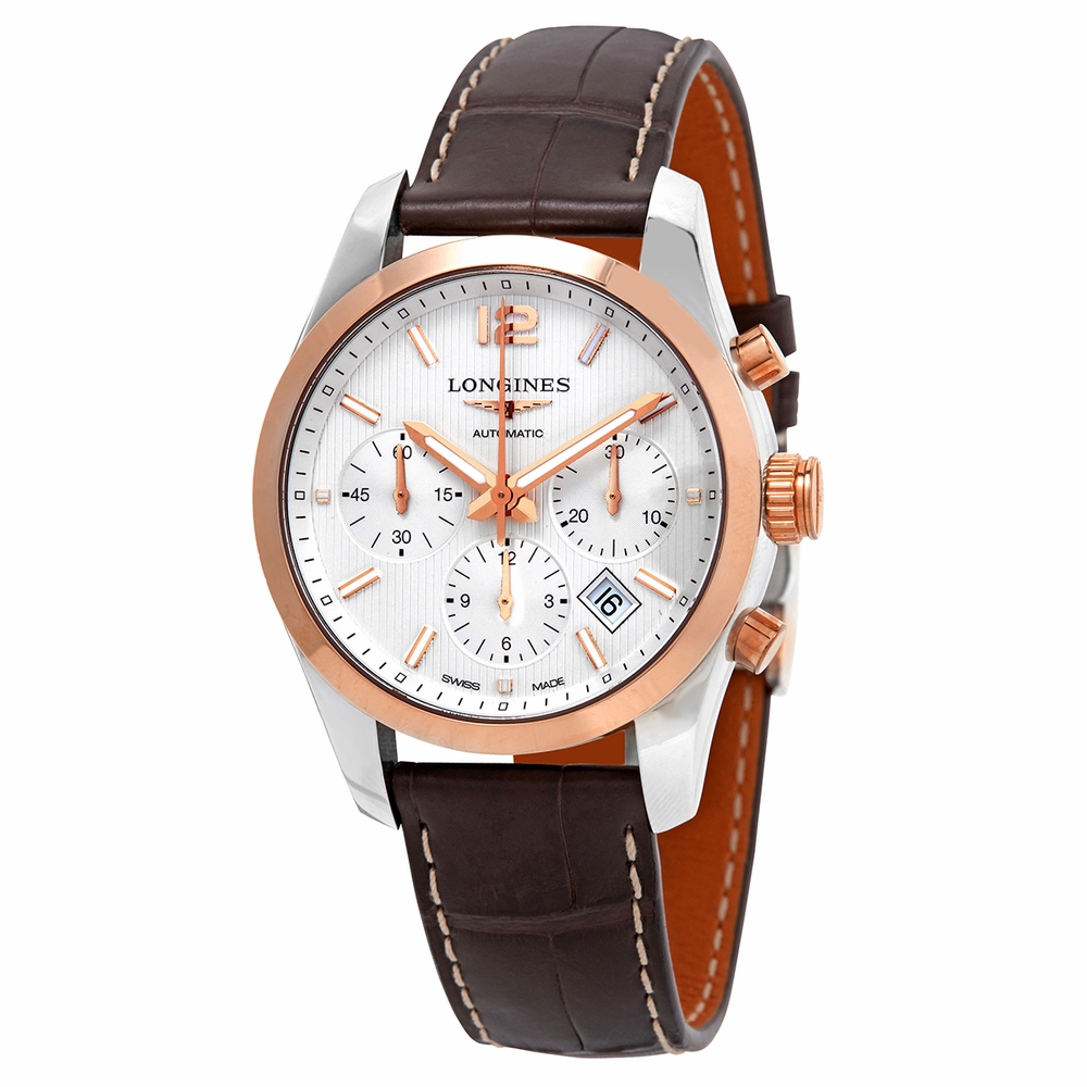 Silver-tone stainless steel case with a brown leather strap. Fixed 18kt rose gold bezel. Rose gold-tone hands and index-Arabic at the 12 o' clock hour markers. Dial Type: Analog. Date display between 4 and 5 o'clock position. Chronograph - three sub-dials displaying: 60 second, 30 minute and 12 hour. Longines Calibre L688 Automatic movement, based upon ETA A08.L01, containing 27 Jewels, bitting at 28800 vph, and has a power reserve of approximately 54 hours. Scratch resistant sapphire crystal. Round case shape, case size: 41 mm, case thickness: 14 mm. Band width: 20 mm. Water resistant at 50 meters / 165 feet. Functions: chronograph, column wheel, date, hour, minute, small second. Conquest Classic Series. Watch label: Swiss Made. Longines Conquest Classic Chronograph Automatic Mens Watch L2.786.5.76.5.