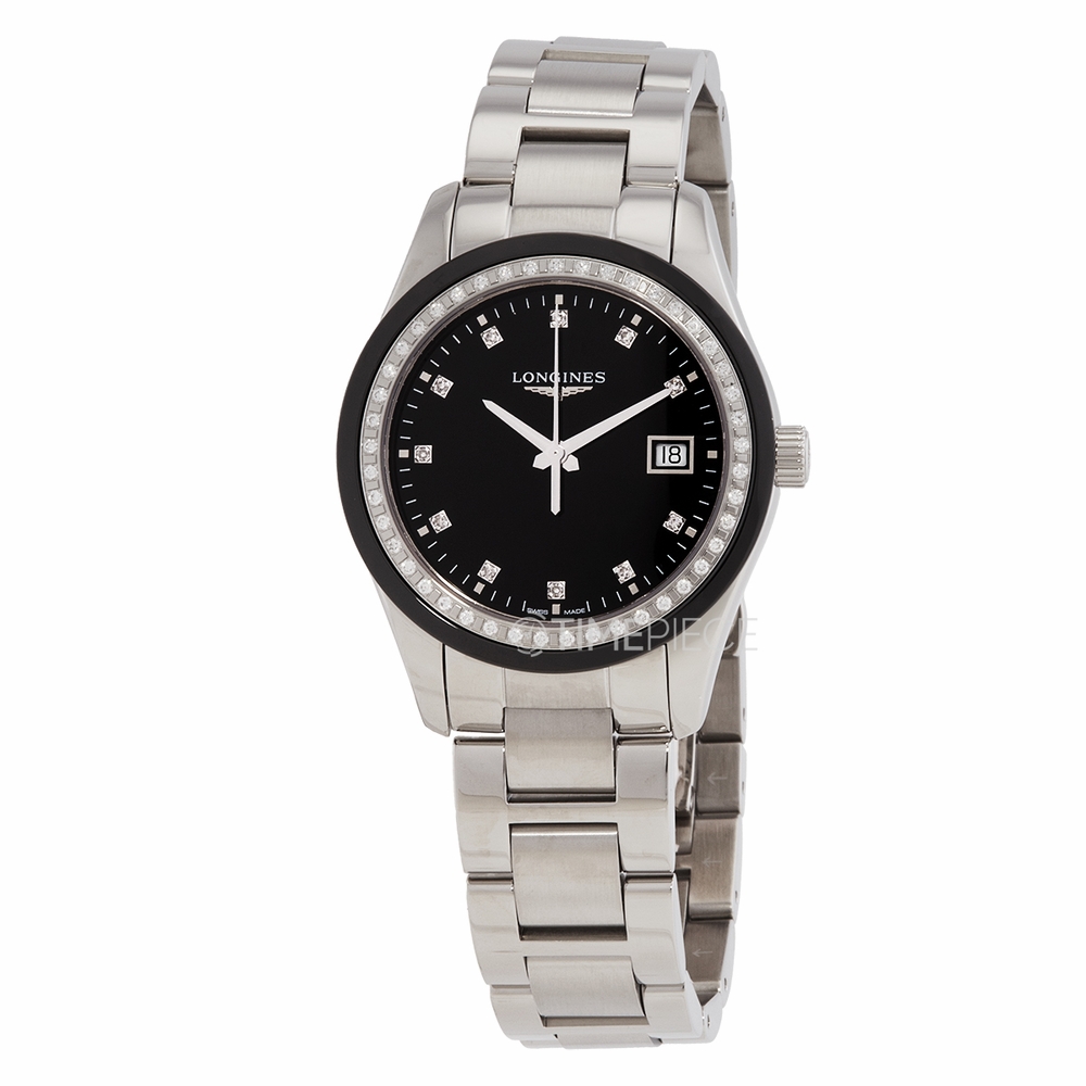 Stainless steel case with a brushed & polished stainless steel bracelet. Fixed bezel. Black dial with silver-tone hands and Roman numeral hour markers. Dial Type: Analog. Date display at the 3 o'clock position. Quartz movement. Scratch resistant sapphire crystal. Pull / push crown. Solid case back. Round case shape, case size: 36 mm. Push button folding clasp. Water resistant at 50 meters. Functions: date, hour, minute, second. Conquest Classic Series. Dress watch style. Watch label: Swiss Made. Longines Conquest Classic Quartz Black Dial Mens Watch L2.387.0.57.6.