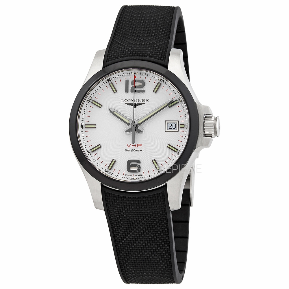 Stainless steel case with a black rubber strap. Fixed stainless steel bezel with an inlaid black ceramic ring. Silver dial with luminous black hands and index hour markers. Arabic numerals appear at the 6 and 12 o'clock positions. Arabic numeral minute markers (at 5 minute intervals). Minute markers around the outer rim. Dial Type: Analog. Luminescent hands and markers. Date display at the 3 o'clock position. Quartz movement. Scratch resistant sapphire crystal. Solid case back. Round case shape. Case size: 41 mm. Band width: 20 mm. Fold over clasp. Water resistant at 50 meters / 164 feet. Functions: hour, minute, second, perpetual calendar. Conquest Series. Dress watch style. Watch label: Swiss Made. Longines Conquest Perpetual Quartz Silver Dial Mens Watch L3.719.4.76.9.