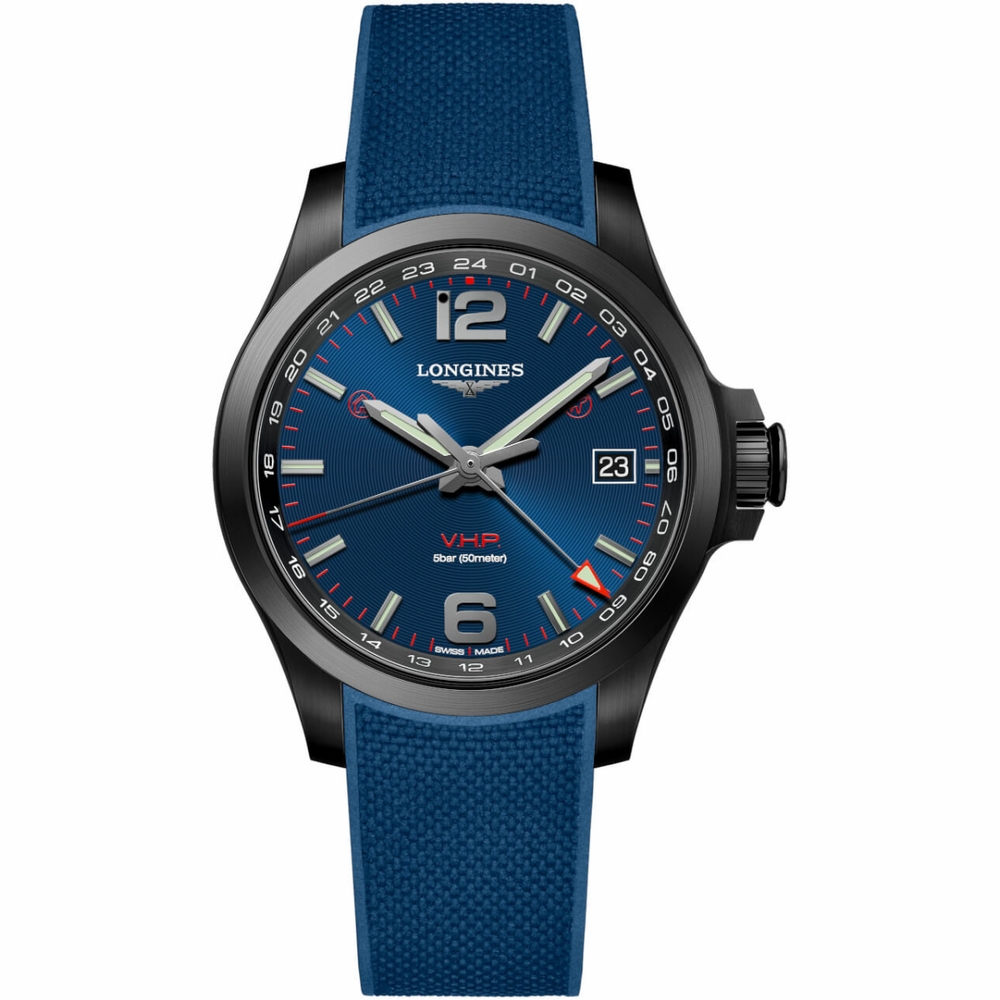 Black PVD stainless steel case with a blue rubber strap. Fixed black PVD bezel. Blue dial with luminous silver-tone hands and index hour markers. Arabic numerals appear at the 6 and 12 o'clock positions. Minute markers. 24 hour markers around the outer rim. Dial Type: Analog. Luminescent hands and markers. Date display at the 3 o'clock position. Longines caliber L289 quartz movement. Scratch resistant sapphire crystal. Smart crown. Solid case back. Round case shape. Case size: 41 mm. Band width: 20 mm. Fold over clasp with a push button release. Water resistant at 50 meters / 164 feet. Functions: GMT, second time zone, hour, minute, second. Additional Info: magnetism detection and correction. Conquest V.h.p. Gmt Series. Dress watch style. Watch label: Swiss Made. Longines Conquest V.H.P. Quartz Blue Dial Mens Watch L3.718.2.96.9.