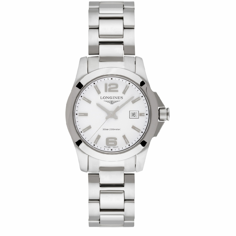 Silver-tone stainless steel case and bracelet. Fixed silver-tone stainless steel bezel. Silver-tone dial with silver-tone hands and index hour markers. Minute markers around the outer rim. Dial Type: Analog. Date display at the 3 o'clock position. Longines Calibre L152 quartz movement. Scratch resistant sapphire crystal. Screw down crown. Solid case back. Round case shape, case size: 29 mm. Fold over clasp. Water resistant at 300 meters / 1000 feet. Functions: date, hour, minute, second. Additional Info: original box, international warranty card, manual (complete accessories). Conquest Series. Luxury watch style. Watch label: Swiss Made. Longines Conquest Quartz Silver Dial Ladies Watch L3.376.4.16.6.