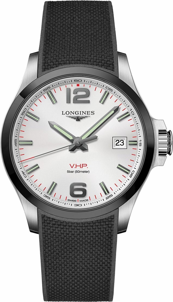 Stainless steel case with a black rubber strap. Fixed black ceramic bezel. Silver dial with luminous silver-tone hands and index hour markers. Arabic numerals appear at the 6 and 12 o'clock positions. Minute markers around the outer rim. Dial Type: Analog. Luminescent hands and markers. Perpetual calendar. Longines calibre L288 quartz movement. Scratch resistant sapphire crystal. Solid case back. Round case shape. Case size: 43 mm. Band width: 22 mm. Fold over clasp. Water resistant at 50 meters / 165 feet. Functions: perpetual calendar, date, hour, minute, second, battery eol indicator, shock resistant, magnetic resistant. Conquest V.h.p. Series. Casual watch style. Watch label: Swiss Made. Longines Conquest V.H.P. Perpetual Quartz Silver Dial Mens Watch L3.729.4.76.9.