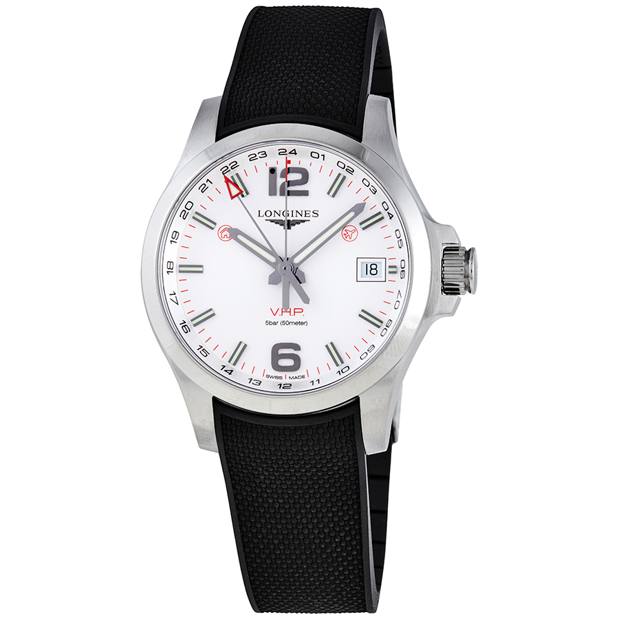 Silver-tone stainless steel case with a black rubber strap. Fixed silver-tone stainless steel bezel. Silver dial with black hands and index-Arabic numerals hour markers. 24 hours. Dial Type: Analog. Luminescent hands and markers. Date display at the 3 o'clock position. Longines Calibre L287 quartz movement. Scratch resistant sapphire crystal. Pull / push crown. Solid case back. Round case shape. Case size: 41 mm. Band width: 20 mm. Folding clasp. Water resistant at 50 meters / 165 feet. Functions: GMT, second time zone, hour, minute, second, date. Casual watch style. Watch label: Swiss Made. Longines Conquest V.H.P. Quartz Silver Dial Mens Watch L37184769.