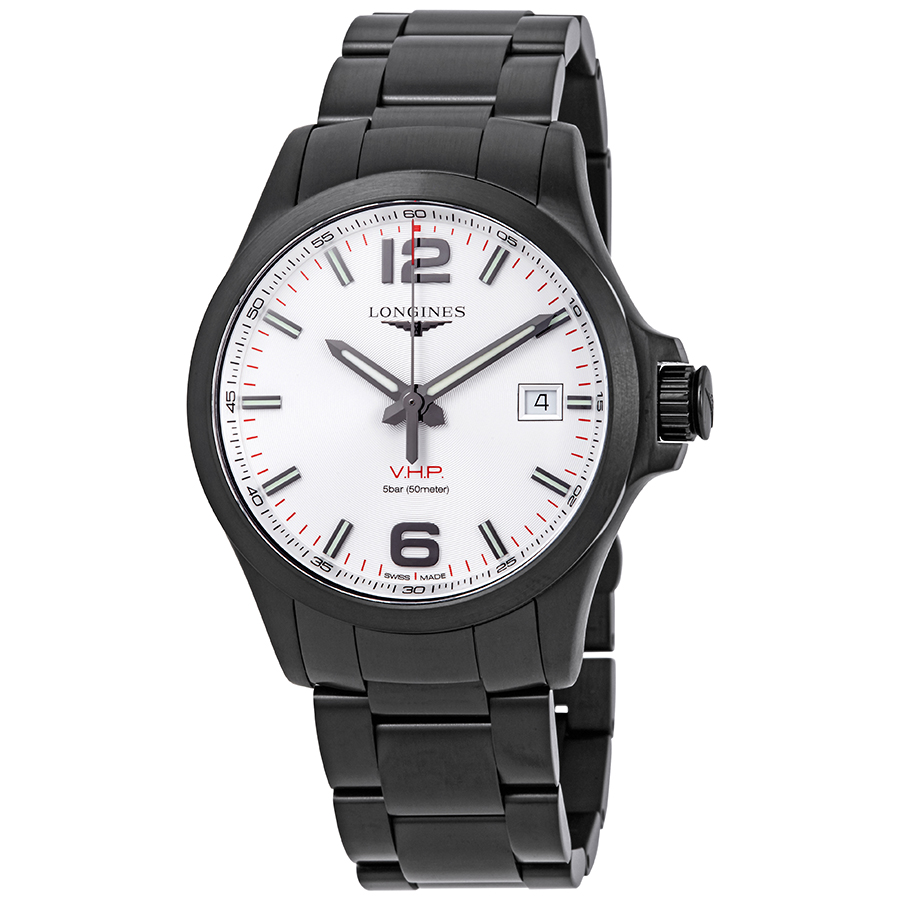 Black PVD stainless steel case and bracelet. Fixed black PVD bezel. Silver dial with luminous black hands and index hour markers. Arabic numerals appear at the 6 and 12 o'clock positions. Arabic numeral minute markers (at 5 minute intervals). Minute markers around the outer rim. Dial Type: Analog. Luminescent hands and markers. Date display at the 3 o'clock position. Longines calibre L288 quartz movement. Scratch resistant sapphire crystal. Solid case back. Round case shape. Case size: 43 mm. Bracelet width: 22 mm. Fold over clasp with a safety release. Water resistant at 50 meters / 165 feet. Functions: date, hour, minute, second. Conquest V.H.P. Series. Casual watch style. Watch label: Swiss Made. Longines Conquest V.H.P. Silver Dial Mens Watch L37262766.
