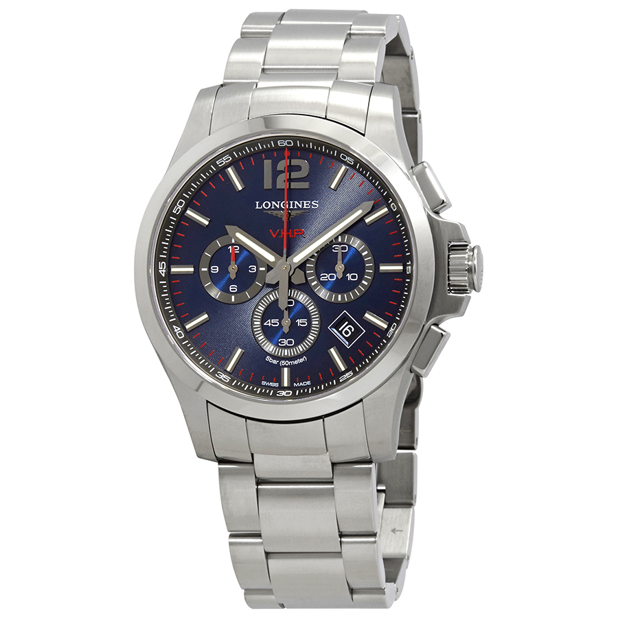Stainless steel case with a stainless steel bracelet. Fixed stainless steel bezel. Blue dial with luminous silver-tone hands and index hour markers. An Arabic numeral appears at the 12 o'clock position. Minute markers around the outer rim. Dial Type: Analog. Luminescent hands and markers. Date display between the 4 and 5 o'clock positions. Chronograph - three sub-dials displaying: 60 second, 60 minute and 12 hour. Longines calibre L289 quartz movement. Scratch resistant sapphire crystal. Pull / push crown. Solid case back. Round case shape. Case size: 44 mm. Band width: 22 mm. Triple fold over clasp with a safety release. Water resistant at 50 meters / 165 feet. Functions: chronograph, perpetual calendar, date, hour, minute, second, battery eol indicator, shock resistant, magnetic resistant. Luxury watch style. Watch label: Swiss Made. Longines Conquest V.H.P. Perpetual Chronograph Quartz Blue Dial Mens Watch L37274966.