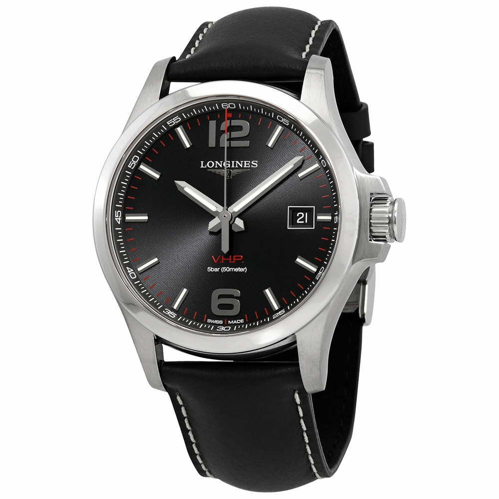 Silver-tone stainless steel case with a black leather strap. Fixed bezel. Black dial with black hands and index-Arabic numerals hour markers. Minute scale around the inner rim. Dial Type: Analog. Luminescent hands and markers. Date display at the 3 o'clock position. Longines Calibre L288 quartz movement. Scratch resistant sapphire crystal. Pull / push crown. Round case shape, case size: 43 mm. Folding clasp. Water resistant at 50 meters / 165 feet. Functions: date, hour, minute, second. Conquest Vhp Series. Watch label: Swiss Made. Longines Conquest VHP Quartz Black Dial Mens Watch L3.726.4.56.2.