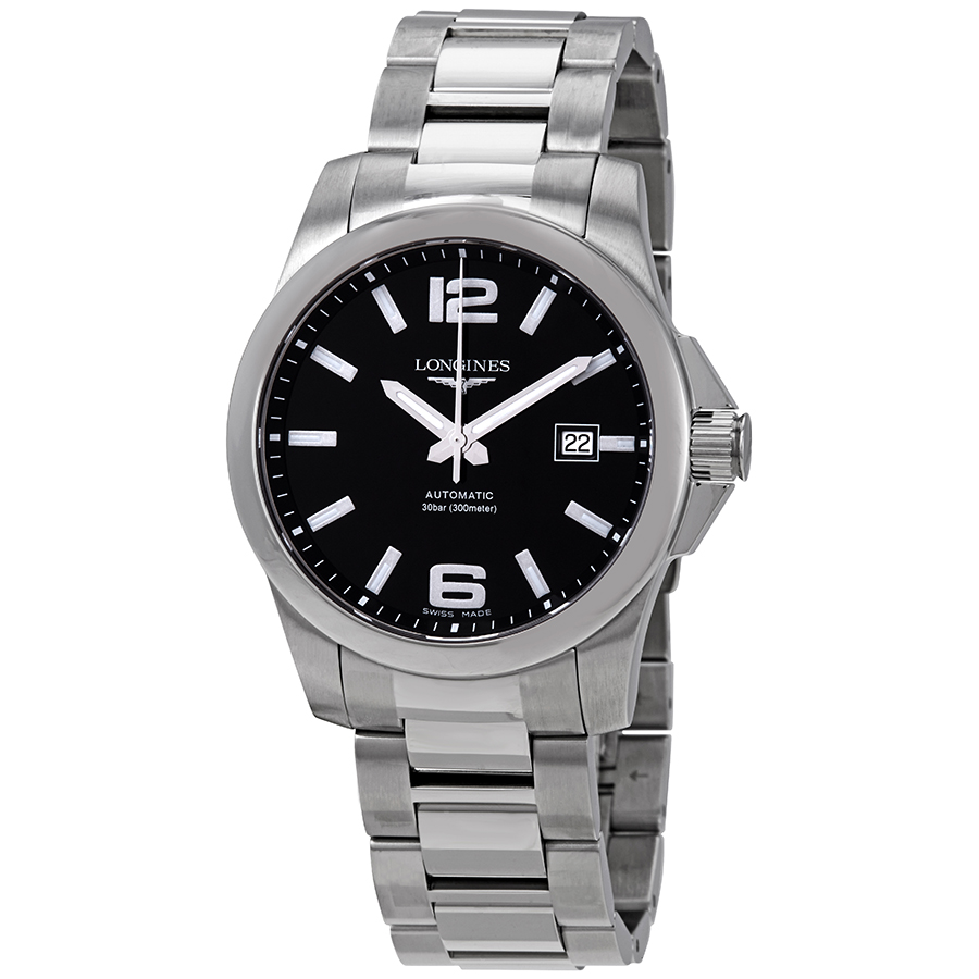 Stainless steel case with a stainless steel bracelet. Fixed stainless steel bezel. Black dial with luminous silver-tone hands and index hour markers. Arabic numerals mark the 6 and 12 o'clock positions. Minute markers around the outer rim. Dial Type: Analog. Luminescent hands and markers. Date display at the 3 o'clock position. Longines calibre L619/888 automatic movement, based upon ETA 2892, containing 21 Jewels, bitting at 25200 vph, and has a power reserve of approximately 64 hours. Scratch resistant sapphire crystal. Screw down crown. Solid case back. Round case shape. Case size: 41 mm. Case thickness: 11.5 mm. Band width: 22 mm. Fold over clasp with a push button release. Water resistant at 300 meters / 1000 feet. Functions: date, hour, minute, second. Conquest Series. Dive watch style. Watch label: Swiss Made. Longines Conquest Black Dial Automatic Mens Watch L3.777.4.58.6.