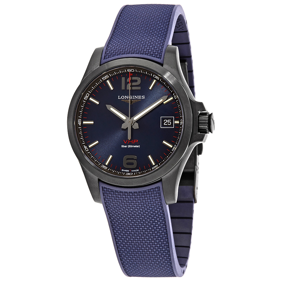 Black PVD stainless steel case with a blue rubber strap. Fixed black PVD bezel. Blue dial with luminous gunmetal hands and index hour markers. Arabic numerals mark the 6 and 12 o'clock positions. Minute markers around the outer rim. Dial Type: Analog. Luminescent hands and markers. Date display at the 3 o'clock position. Longines calibre L288 quartz movement. Scratch resistant sapphire crystal. Pull / push crown. Solid case back. Round case shape. Case size: 41 mm. Band width: 20 mm, band length: 7 inches. Double fold over clasp with a safety release. Water resistant at 50 meters / 165 feet. Functions: perpetual calendar, date, hour, minute, second, battery eol indicator, shock resistant, magnetic resistant. Luxury watch style. Watch label: Swiss Made. Longines Conquest V.H.P. Perpetual Quartz Blue Dial Mens Watch L37162969.