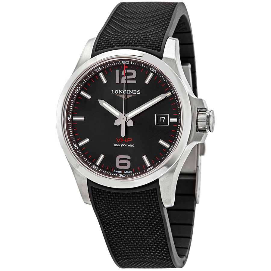 Stainless steel case with a black rubber strap. Fixed stainless steel bezel. Black dial with silver-tone hands and index hour markers. Arabic numerals mark the 6 and 12 o'clock positions. Minute markers around the outer rim. Dial Type: Analog. Luminescent hands and markers. Date display at the 3 o'clock position. Longines calibre L288 quartz movement. Scratch resistant sapphire crystal. Pull / push crown. Solid case back. Round case shape. Case size: 43 mm. Band width: 22 mm. Double fold over clasp with a safety release. Water resistant at 50 meters / 165 feet. Functions: perpetual calendar, date, hour, minute, second, battery eol indicator, shock resistant, magnetic resistant. Luxury watch style. Watch label: Swiss Made. Longines Conquest V.H.P. Perpetual Quartz Black Dial Mens Watch L37264569.