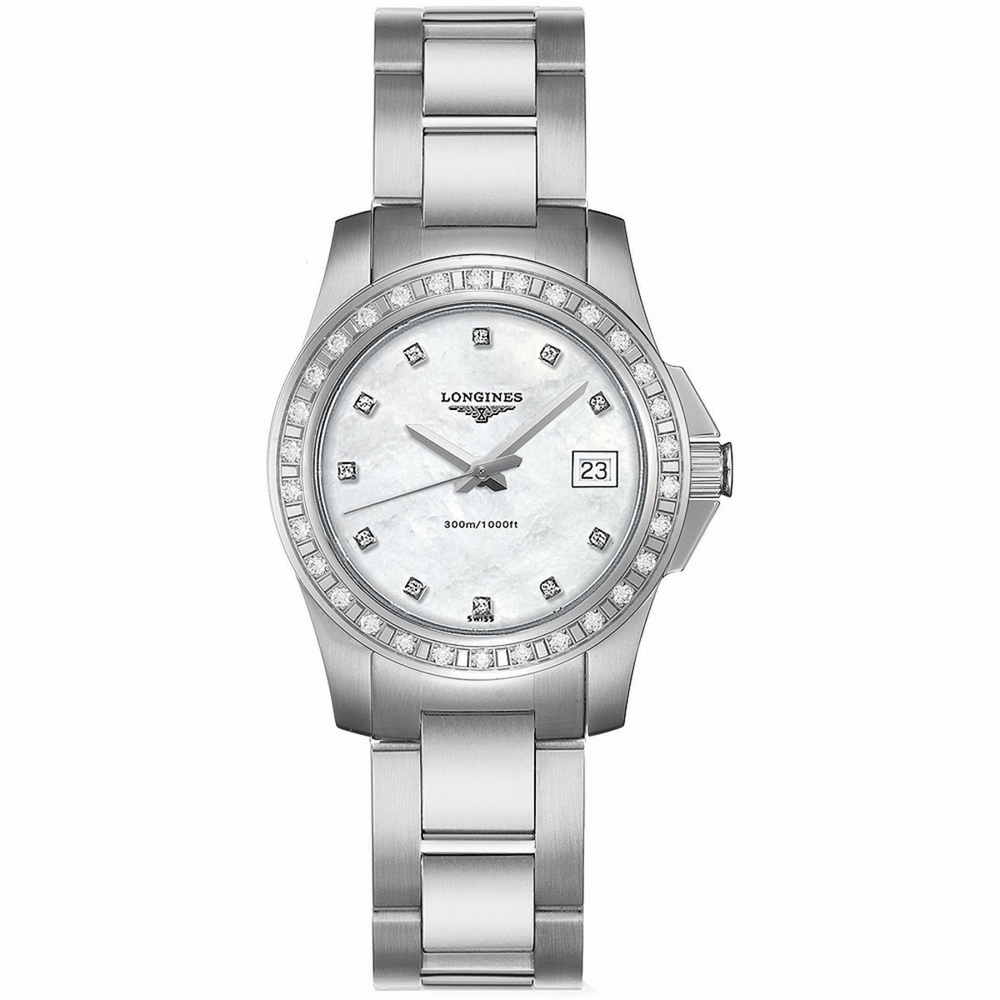 Stainless steel case with a stainless steel bracelet. Fixed stainless steel bezel set with 60 diamonds. White dial with silver-tone hands and diamond hour markers. Dial Type: Analog. Date display at the 3 o'clock position. Longines calibre L250 quartz movement. Scratch resistant sapphire crystal. Screw down crown. Solid case back. Round case shape. Case size: 29.5 mm. Case thickness: 9 mm. Fold over clasp with a push button release. Water resistant at 300 meters / 1000 feet. Functions: date, hour, minute, second, battery eol indicator. Additional Info: original box, manual (complete accessories). Conquest Series. Luxury watch style. Watch label: Swiss Made. Item Variations: L3 258 0 88 6, L3-258-0-88-6, L3/258/0/88/6, L32580886. Longines Conquest Quartz Diamond White Dial Ladies Watch L3.258.0.88.6.