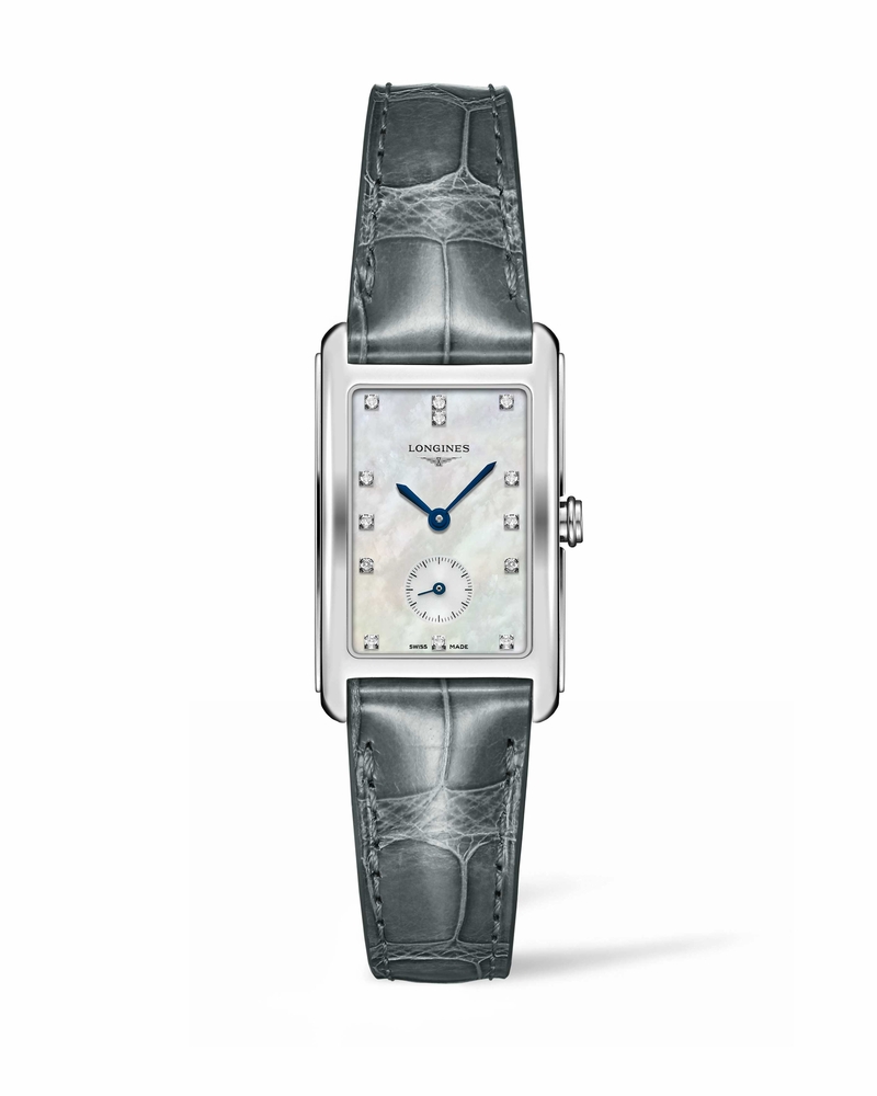 Stainless steel case with a grey leather strap. Fixed stainless steel bezel. Mother of pearl dial with blue hands and diamond hour markers. Dial Type: Analog. Small seconds sub-dial. Longines calibre L176 quartz movement. Scratch resistant sapphire crystal. Pull / push crown. Solid case back. Rectangle case shape. Case dimensions: 23 mm x 37 mm. Band width: 17 mm. Tang clasp. Water resistant at 30 meters / 100 feet. Functions: hour, minute, small second. Dolcevita Series. Dress watch style. Watch label: Swiss Made. Item Variations: L5.512.4.87.3. Longines DolceVita Quartz Diamond Mother of Pearl Dial Ladies Watch L5.512.4.87.3.